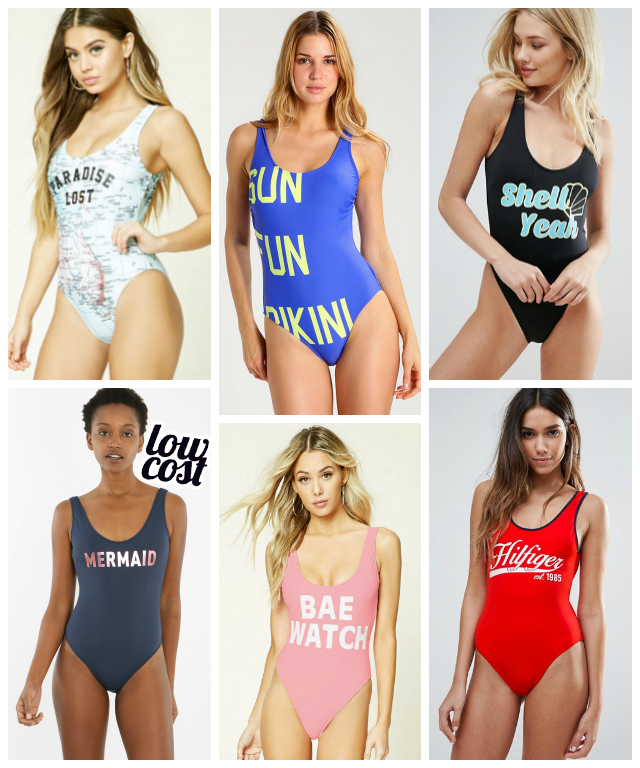 Una de las tendencias más presentes en las tiendas es la de los bañadores con mensaje. Todos ellos tienen en común, además del mensaje, una silueta clásica con tirante ancho que los convierte en la opción más cómoda.